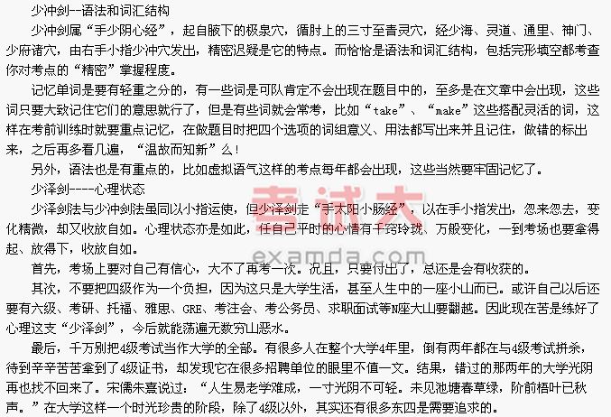 关于做阅读理解的方法,建议最好还是先粗看文章,注意细读段首句,以便掌握大概的意思,然后再看问题,按照问题从文章中直接查阅相关的句子和段落,找出答案。因为4级考试是比较重视细节的,所以“检索查找”是个好办法。