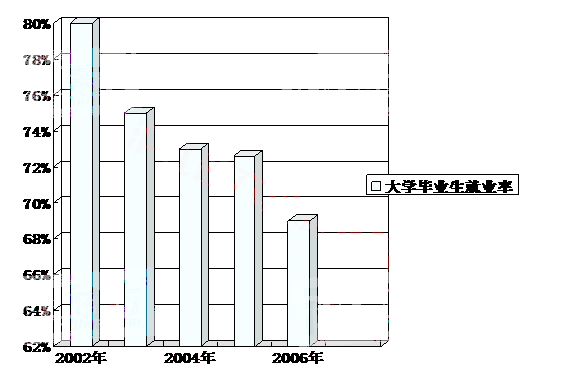 The employment rate of university graduates is declining nowadays. Reading this chart, we can find that the employment rate ofuniversity graduates has declined gradually. It declined from 80 percent in 2002 to nearly 75 percent in 2004, and finally, the rate dropped to no more than 70 percent in 2006.