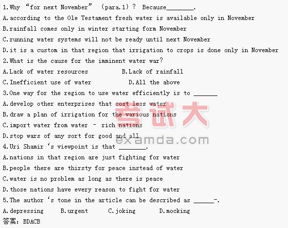 I came here to examine this crisis in the making, to investigate fears that “water wars ”are imminent, that water has replaced oil as the region‘s most contentious commodity. For more than two months I traveled through three river valleys and seven nations ——from southern Turkey down the Euphrates River Syria, Iraq, and on to Kuwait; to Israel and Jordan, neighbors across the valley of the Jordan; to the timeless Egyptian Nile.