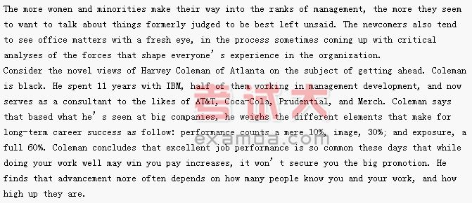 Ridiculous beliefs? Not to many people, especially many women and members of minority races who, like Coleman, feel that the scales(障眼物)have dropped form their eyes. “Women and blacks in organizations work under false beliefs,” says Kaleel Jamison, a New York-based management consultant who helps corporations deal with these issues. “They think that if you work hard, you’ll get ahead-that someone in authority will reach down and give you a promotion.” She adds, “Most women and blacks are so frightened that people will think they’ve gotten ahead because of their sex or color that they play down(使不突出)their visibility.” Her advice to those folks: learn the ways that white males have traditionally used to find their way into the spotlight.