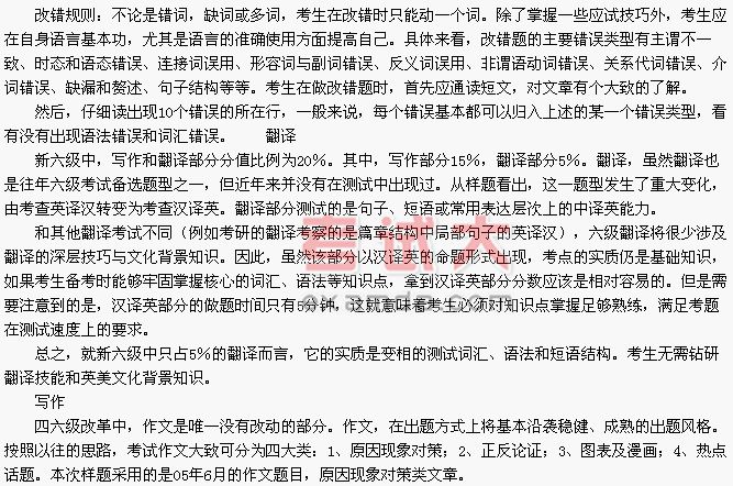 阅读理解是新六级中变化最大的一块。原来单调的“看文章,选答案”的考试样式部分保留,而新出现的快速阅读无疑是考试的一个亮点。考生被要求在15分钟内浏览1000字以上的一篇文章,同时还要做4个“对、错、未提及”的判断题,还要再接再厉做6个填空,这样快节奏的考试,对很多奉行“一慢二看三选择”解题思路的同学来说无疑是个打击。而另外短文问答的部分,也更加强调了考生写英文的能力。从中看出,“读写综合考察”是改革后四六级的基本思路。