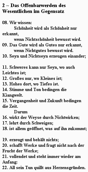 天下皆知美之为美,斯恶已。皆知善之为善,斯不善已。 有无相生,难易相成,长短相形,高下相盈,音声相和,前后相随。恒也。 是以圣人处无为之事,行不言之教; 万物作而弗始,生而弗有,为而弗恃,功成而不居。夫唯弗居,是以不去。