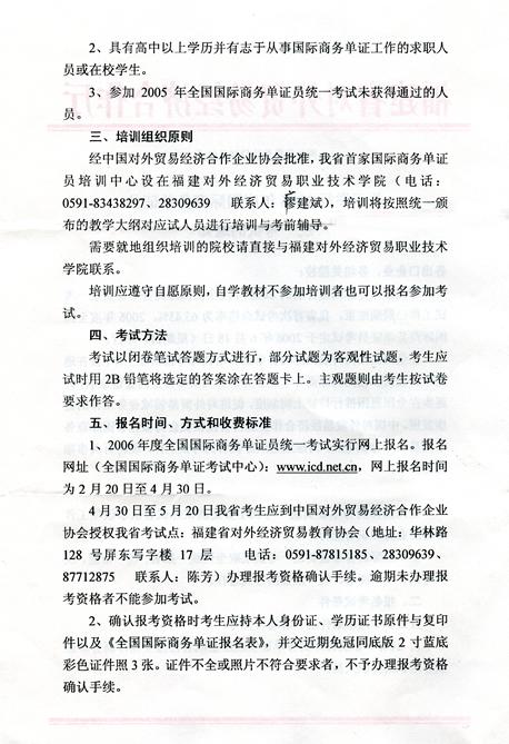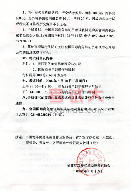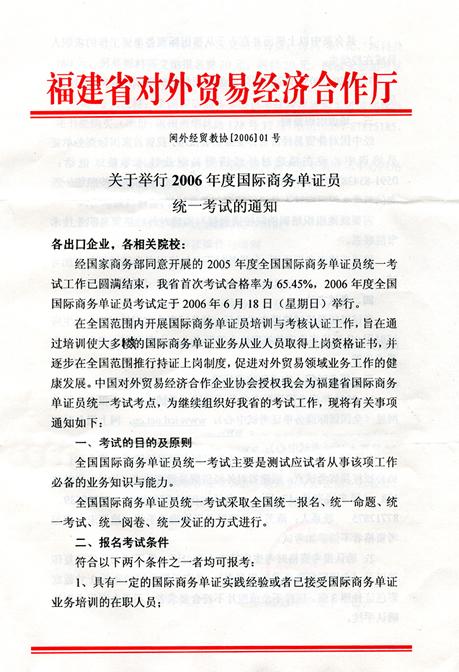 福建省关于举行2006年国际商务单证员统一考试的通知