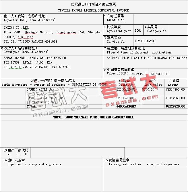 单证员综合辅导单证相关知识:纺织品出口许可证商业发票