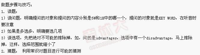 ii. 多选多,很多考生觉得多选多看似很难,其实多选多的考点都是一些容易听到的例子或是细节,而且题目会告诉考生要选几个,如Which three ……,考生只要当心不要遗漏就可以了。有时,选择题不是以问题加选项这种常规的方式出现,而是以图表,或是表格的形式出现,不管怎么变形,只要我们找出问题和选项,都可以还原到最常规的形式 。