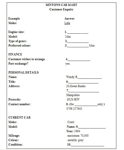Answer:Questions 1-10:1.1.4 litres / 1.4 liters2.automatic3.light / sky4.credit5.Harries6.Dr / Doctor7.Alton8.messages9.Lion10.reasonable