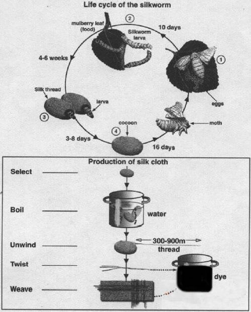 Overall, the two diagrams reveal the stage of producing cocoons in the life cycle of the silkworm can be used to make silk cloth through 5 simple steps.