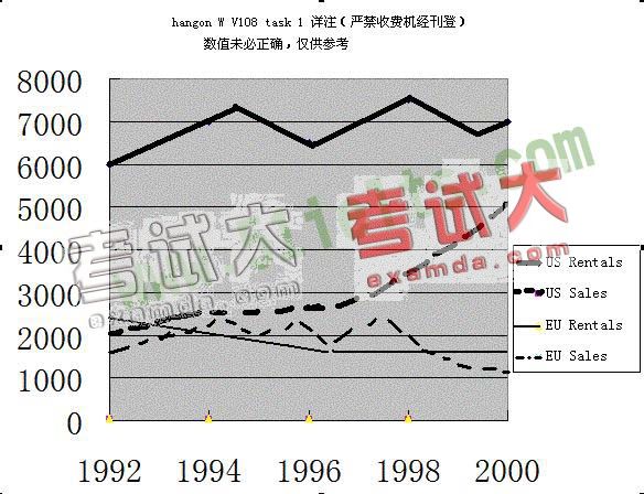 The graph shows the value of sales and Rentals of videos( US dollar) of the United States and the European Union, between 1992 and 2000. 来源:www.examda.com