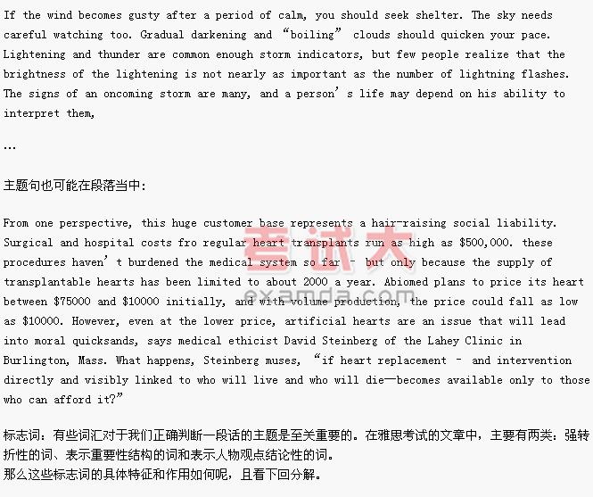 有时候主题句也会出现在整段话的最后。这样的结构安排,通常出现在一个讨论困难的、不为大众所接受的话题或者文章的主要目的是为了说服读者接受某种结论的段落中。因为先把道理说清楚,那么读者就会比较容易接受新的观点和看法。