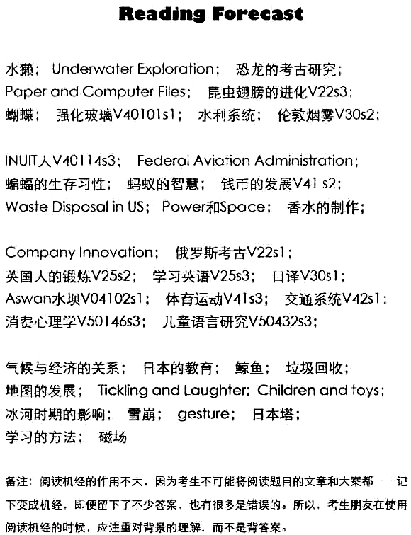阅读机经的作用不大,因为考生不可能将阅读题目的文章和答案都一一记下变成机经,即便留下了不少答案,也有很多是错误的。所以,考生朋友在使用 阅读机经的时候,应注重对背景的理解,而不是背答案。注意阅读预测考过的题目可能会在一段时间内再次重复。