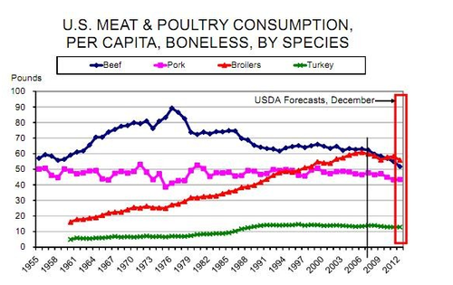 到2012年,平均每位美国人牛肉的消耗量跌落到大约50磅,但是鸡肉的消费量上涨到了20世纪70年代的两倍,到达大约每人55磅。相比之下,猪肉和火鸡肉的消费类在整个时间段内没有太大的变化趋势。