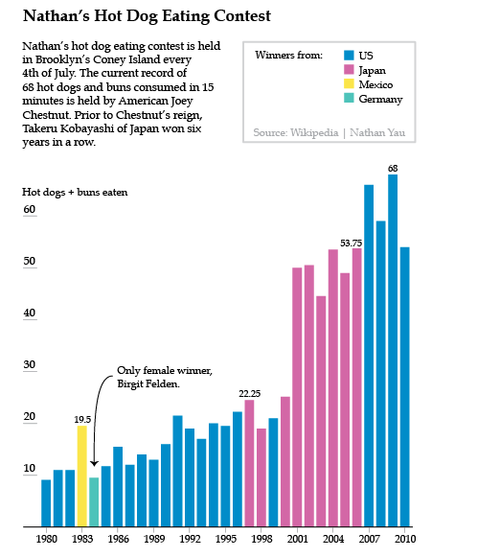 很明显,获胜者所吃的热狗和圆饼数量在所展示的时间里急剧上升。大部分获胜者为美国人或日本人。只有一位女性曾经赢得过这个比赛。