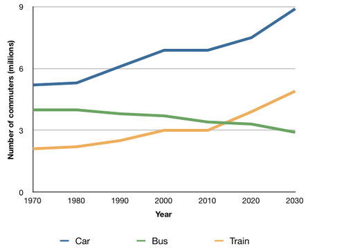 The graph below shows the average number of UK commuters traveling each day by car, bus or train between 1970 and 2030.