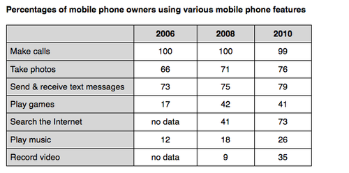 Over the following 4 years, there was relatively little change in the figures for the top three mobile phone features. However, the percentage of people using their phones to access the Internet jumped to 41% in 2008 and then to 73% in 2010. There was also a significant rise in the use of mobiles to play games and to record video, with figures reaching 41% and 35% respectively in 2010.