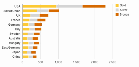It is clear that the USA is by far the most successful Olympic medal-winning nation. It is also noticeable that the figures for gold, silver and bronze medals won by any particular country tend to be fairly similar.
