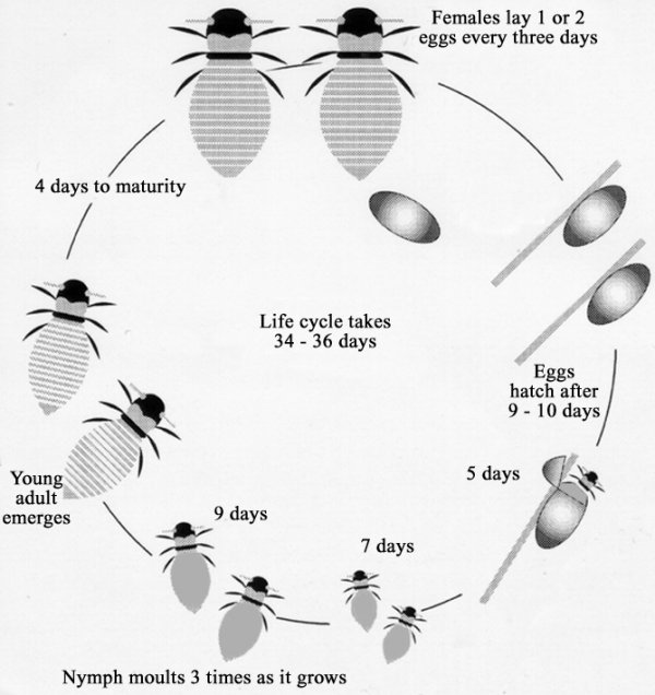 在生命周期的第三个阶段,nymph在大小上有所增长,并且会蜕三次皮。第一次蜕皮发生在卵孵化后的第5天,然后是7天之后,最后是9天之后。生命周期开始30到31天之后,年轻的成年蜜蜂从最后一次蜕皮阶段中出现,只需要再花4天就可以达到完全成熟(共169个单词)。