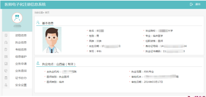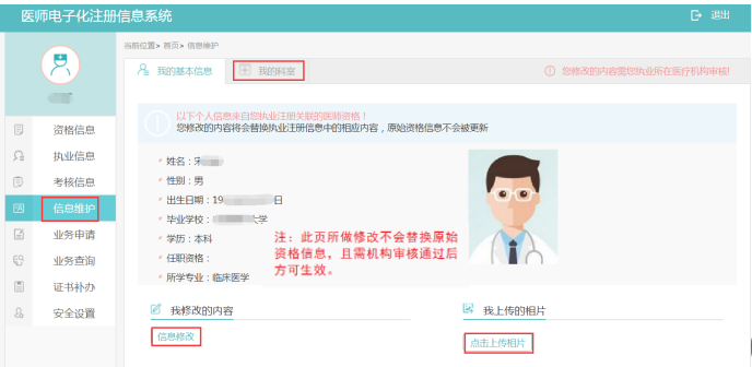 (三)修改执业注册信息中的相关内容:个人信息修改(学历、毕业院校、任职资格)、个人照片更新、科室信息设置。