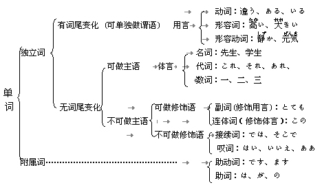 日语的词类:日语按词的意义、形态、和句中的作用可细分为12类: