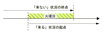 教科書の場合は、火曜日、つまり一日という幅の中でのできごとです。「XマデP」の「X」は「非瞬間時」を表しています。火曜日は「来ない」の終点でもあり、「来る」の起点でもあります。ですから、上記の(a)(b)二つの解釈が考えられるのです。
