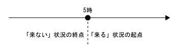 この場合は、「Xマデ」の「X」は「5時」という「点」を表しています。つまり、瞬間時に「来ない」状況と「来る」状況が生まれます。「5時」はその境界を表しており、ここでは「5時に来る」という解釈が成り立ちます。