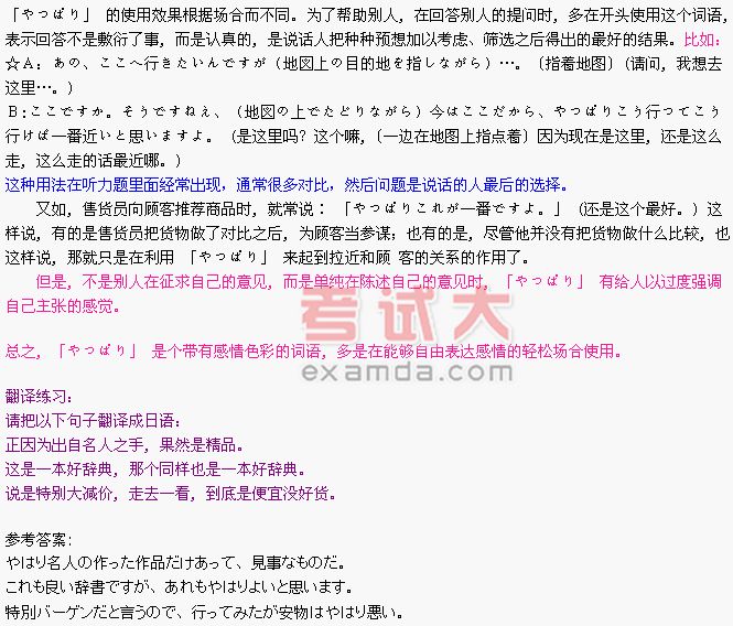 「やっぱり」 是使用颇为频繁的词。对于这个表达心理活动的词语, 初学者由于很难抓住它的确切含意, 因此, 常常误以为它是可有可无的。但是, 从它被用得这么频繁来看, 它就不会是一个可有可无的词语。