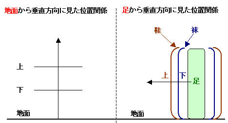 したがって、「靴下」の場合は、足から垂直に見て靴よりは下、という意味で「靴下」という言い方になるわけです。その場合、なぜ「足上」と言わないのかという点が疑問になるかもしれませんが、「上/下」というときは、あくまでも身に着けるもの同士の相対的な上下が問題となるため、足ではなく靴を基準にするわけです。