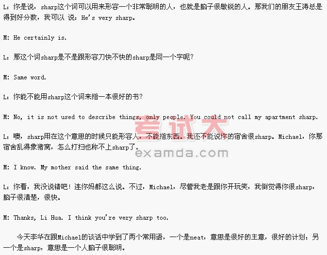 Michael和李华都在纽约上大学。Michael对纽约很熟,因此经常带李华到一些著名的地方去参观。今天他俩要去纽约的大都会艺术博物馆去听讲演。李华将学到两个常用语:neat和sharp。