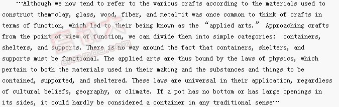 仔细阅读这一段,我们发现这一段主要是在讨论1,在过去,人们常常是根据功能来区分手工艺术品的,从而产生了“applied arts(应用艺术品)”这一概念;2,从功能的角度来区分手工艺术品,可以把它们分为收纳物(container)、遮蔽物(shelter)、支撑物(support);3,应用艺术品受到laws of physics的限定,不仅限定了制作这些艺术品的材料也限定了他们所收纳的、遮蔽的、支撑的物体。这些laws是防止四海皆准的,在任何文化信仰、世界的任何地方和任何一种气候条件都是一样的。比如如果一个没有底的罐子或是一个在旁边开口的罐子,就很难被定一位是收纳物。来源:考试大