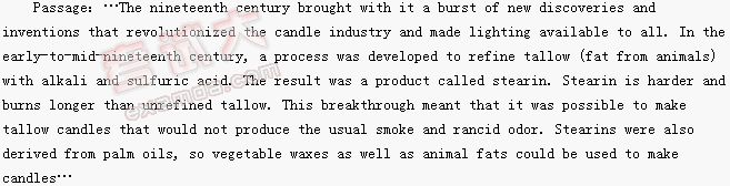 文章第一句同时也是一个时间的分水岭,告诉我们19世纪蜡烛工业的变革是怎么样的。“在19世纪早期到中期,蜡烛处理工艺使用alkali和sulfuric acid来提炼tallow,提炼后的产品就是stearin,stearin比未经提炼的tallow坚硬而且燃烧得更久。这一巨大的变化意味着制造出不产生烟和rancid味道的蜡烛是可能的。”在这里的一个关键词是rancid,意思是(油脂食物,其味道、气味)不新鲜的;腐臭的;正好与选项b的pleasant odor相反。19世纪前的蜡烛产生usual smoke(经常有烟),这与选项a相反。Sulfuric acid是19世纪用来处理fallow的材料,在19世纪以前是没有使用的,这与选项d相反。