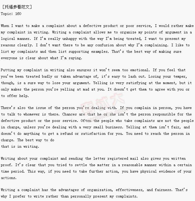 Topic160 When people need to complain about a product or poor service, some prefer to complain in writing and others prefer to complain in person. Which way do you prefer? Use specific reasons and examples to support your answer.
