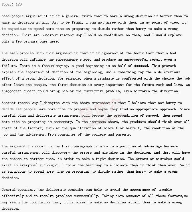 Topic120 Decisions can be made quickly, or they can be made after careful thought. Do you agree or disagree with the following statement? The decisions that people make quickly are always wrong. Use reasons and specific examples to support your opinion.