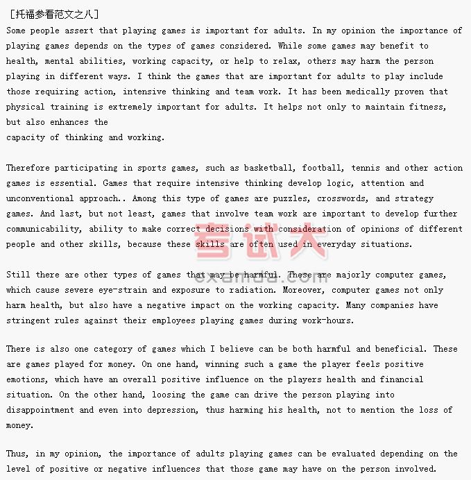 I do strongly support the idea that playing games is important for adults.It is useful and fun,too.It is one of the most important ways to cope with the problems of business and daily life.There are several benefits of playing games for adults.First,playing games creates leisure time that every adult must have to lessen the stress of business life.Its another benefit is that It can improve reflex, intelligence or health depending on the kind of the game ,and it also gives pleasure to the adults as well as children.