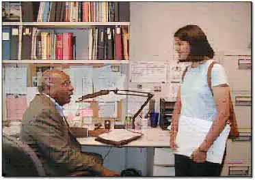 2、答题界面大不同 新托福改变旧托福一味强迫考生纯粹用耳朵接受信息,用眼睛扫描选项的抽象界面,代之以大量相关图片配合声音资料,活化题目场景,加强考生的理解程度。例如下面这幅图片明显表明是一位教授与一个女生在办公室里的一段对话: