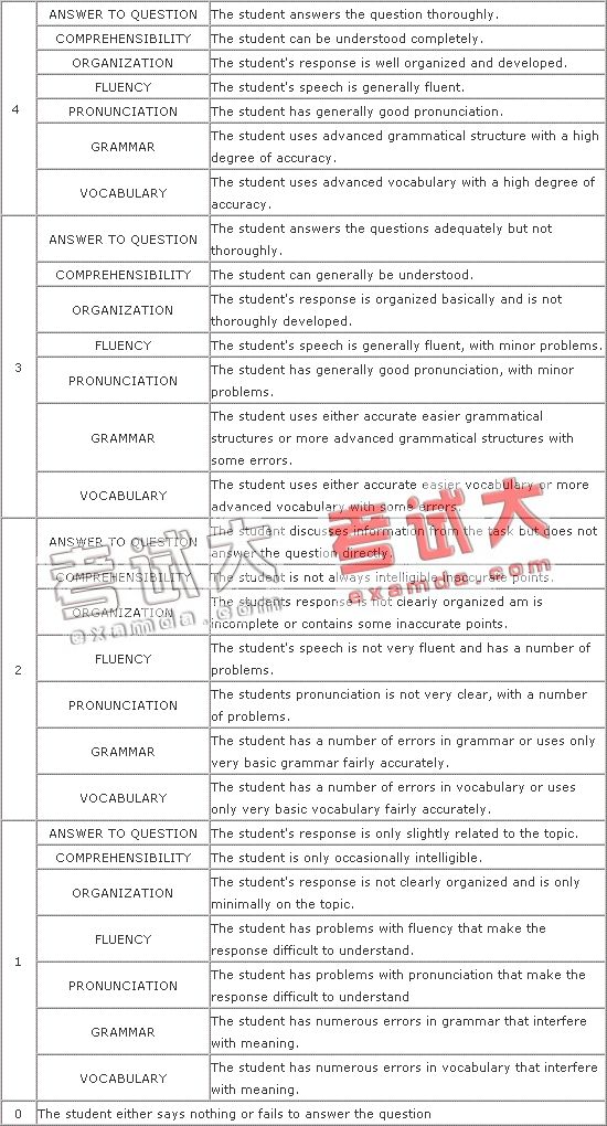 Speaking Scoring Criteria of Next Generation iBT TOEFL Test In the Speaking section, you will receive a score of 0 through 5; this score of 0 through then be converted to a scaled score out of 30. The criteria for Speaking scores of 0 through 4 are listed below.