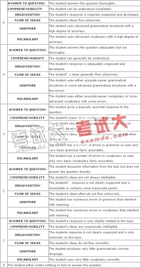 In the Writing section, you will receive a score of 0 through 5; this score of 0 through 5 will then be converted to a scaled score out of 30. The criteria for Writing scores of 0 through 5 are listed below.