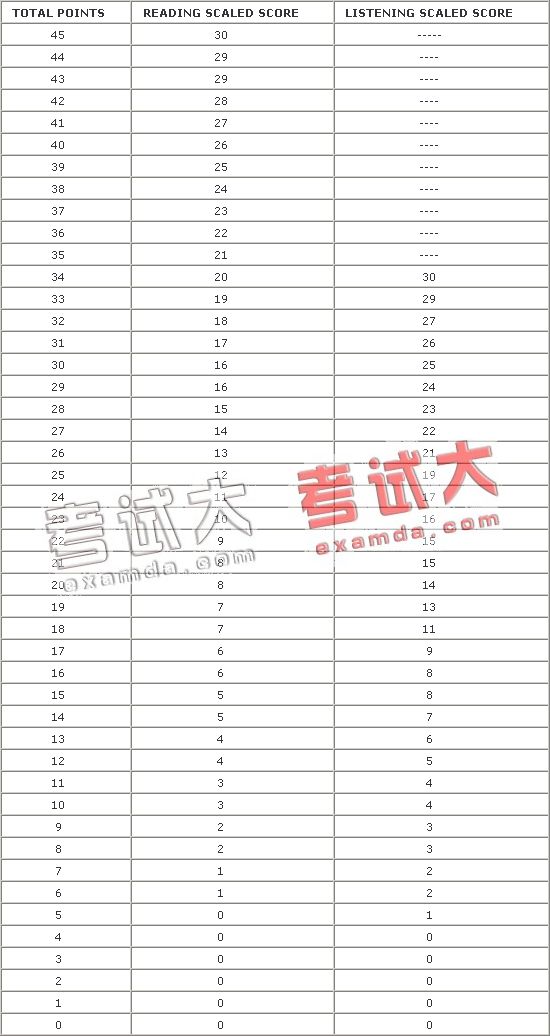 DETERMINE READING AND LISTENING COMPLETE TEST SCORES To determine a scaled score in a Reading or Listening Complete Test section, you must first determine the number of points you received in the section. In Listening, you simply need to count the number of questions you answered correctly (out of 34) because the number of points is the number of questions you answered correctly. In Reading, you must determine the number of points you received on the last question of each reading (numbers 13, 26, and 39) before you can determine the total number of points. The last question of each reading is a chart question that is worth more than one point, and you may receive partial credit for a partially correct answer. (For example, perhaps a question is worth three points and has 6 correct answers. If you correctly answer all 6, then you get 3 points. If you correctly answer 4 or 5, then you get 2 points. If you correctly answer 2 or 3, then you get 1 point. If you por?tly answer 0 or 1, then you get 0 points.) After you have determined the number of points you have earned on the chart questions, add this number to the number correct on the rest of questions 1 through 39 to determine your total points out of 45. When you know the total points you received in a Reading or Listening Mini-Test section, you can refer to the following irt to determine your scaled score out of 30 for this section.