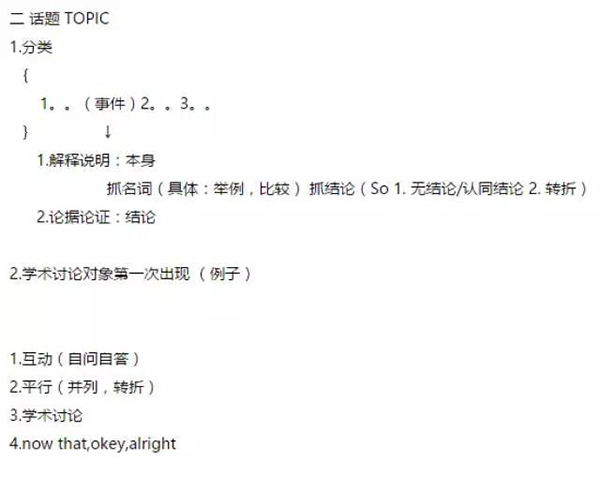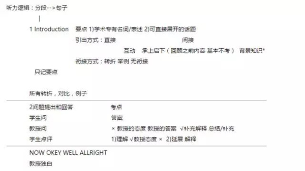 美联的听力老师将lecture分为了独白型和对话型,独白型又分两种。每一种类型需要记的东西,分段的方法都不一样。而在能够识别文章类型之后,记起笔记来真是各种记得多,而且都是考点(之前我撑死就记半页草稿,现在起码记1页半)。关键是原先一记就漏考点,现在记的都是考点,不记得都不考。