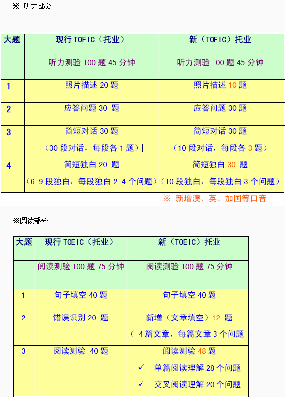 3、现行TOEIC(托业)与新TOEIC (托业)考试对照