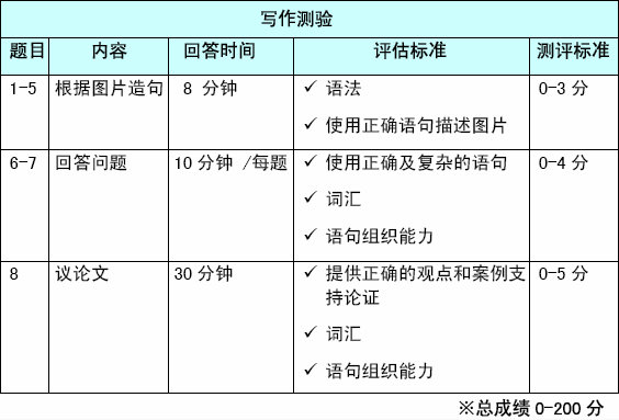 评分者主要根据文章的整体结构,语法和词汇准确性进行评分.测试大致共60分钟,包含8个问题。请参考下表:
