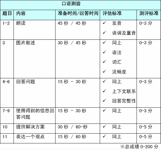 口语考试对考生能力的测评范围主要包括:发音、音调、语法、词汇连贯性和内容完整性。测试大致20分钟,包含11个问题.请参考下表: