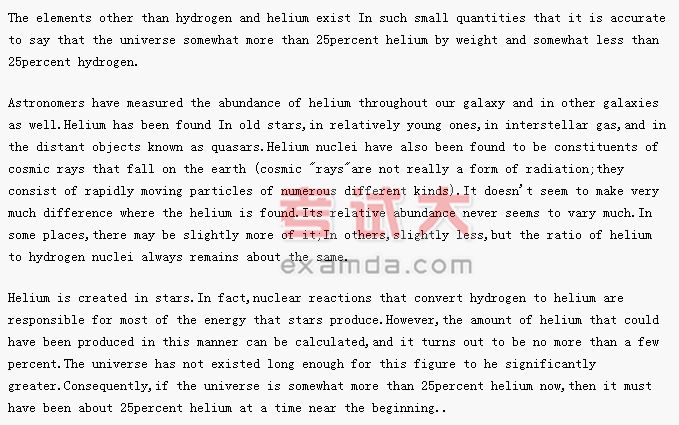 However,when the universe was less than one minute old,no helium could have existed.Calculations indicate that before this time temperatures were too high and particles of matter were moving around much too rapidly.It was only after the one-minute point that helium could exist.By this time,the universe had cooled sufficiently that neutrons and protons could stick together.But the nuclear reactions that led to the formation of helium went on for only a relatively short time.By the time the universe was a few minutes old,helium production had effectively ceased.