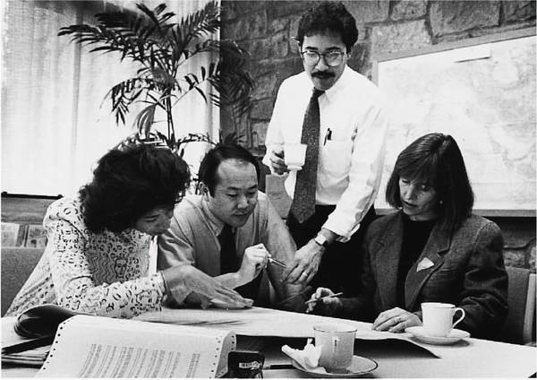 Statement (B), “They’re having a meeting,” best describes what you see in the picture. Therefore, you should choose answer (B).