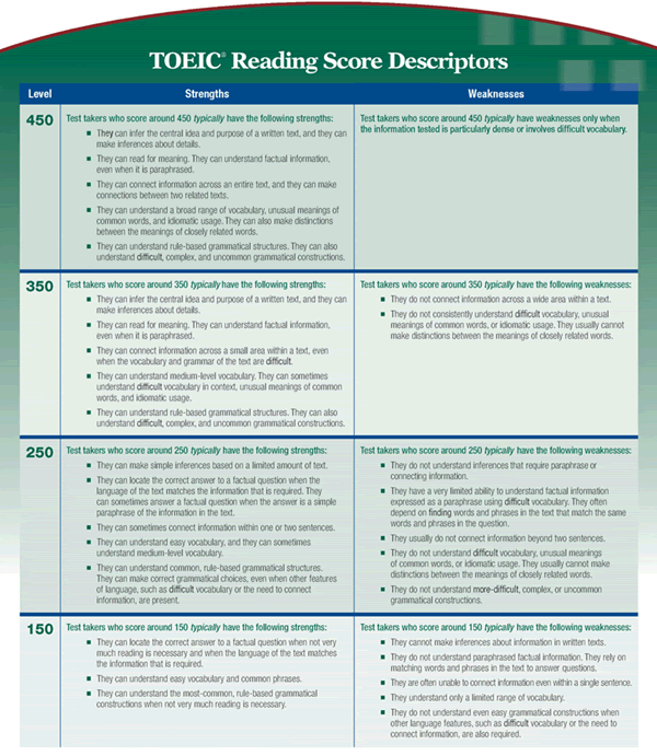 新托业考试(TOEIC)阅读部分评分标准