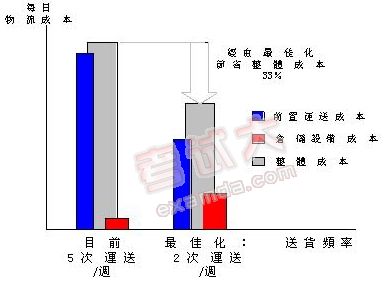 根据此最佳化研究结果,对多数货运公司而言,高载率及每天送货所造成的成本最划算。相反地,对小量的供货商而言,减少送货频率,可以明显降低整体成本。图3所示,对一个只专门服务BMW的某工厂之供货商而言,在每天送货的情况下,前置运送的成本将占整体成本的大部分,而仓储设备所造成影响则较小。如果这家供货商每周只送货两次,则会造成仓储设备需求提高,不过,前置运送的节省部分可以贴补仓储成本提高的部分。