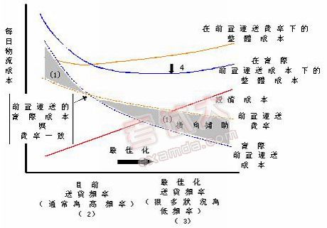 图2显示目前的货运费率及实际前置运送费用,图中显示横向补助的效果(区域(1)),蓝色虚线部分表示前置运送实际成本,棕色虚线部分为前置运送的费率。以目前的运送费率最佳化,会产生高送货频率(图2中(2))。如果依实际前置运送成本计算,则最佳化点将移向送货频率低处(图2中(3))。如此,可把整体成本在实际前置运送成本下达到最低值(图2中(4)所视为物流成本节省部分)。