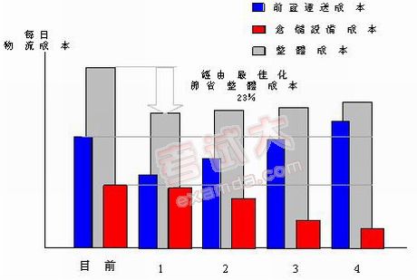 图4为BMW三个组装厂对同一家供货商的4种最佳化之不同选择,其共同处为整体成本差异不大,其中选择1的仓储设备及前置运送成本同时降低,节省成本约23%。