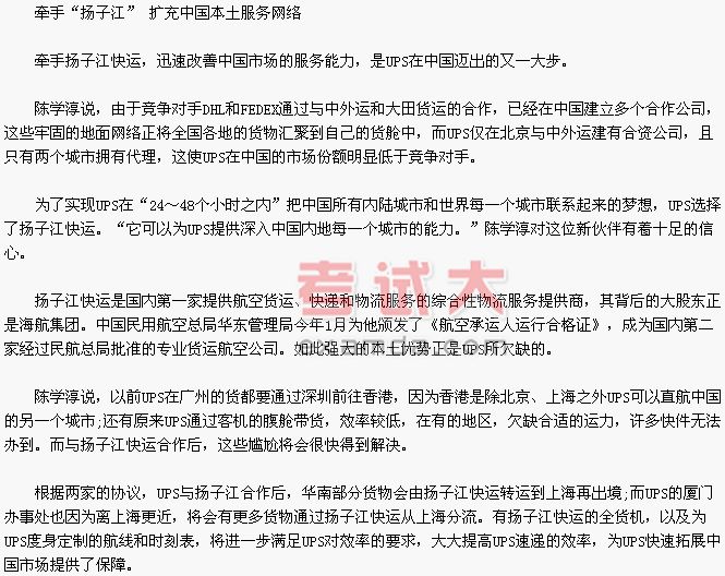 陈学淳认为,目前跨国公司纷纷把生产基地转移到中国,其全球供应链管理过程一定要有快递公司的参与。这也为UPS这样拥有大量跨国公司客户的国际快递公司提供了巨大商机。