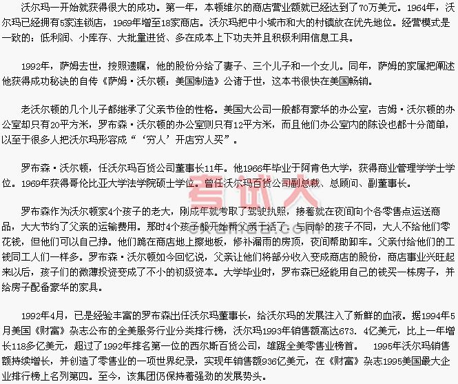 40年前,沃尔玛还只是美国肯萨斯州一个小镇上的夫妻店。而现在,沃尔玛已经在美国拥有传统连锁店1702家、超市952家、“山姆俱乐部”商店479家、街区杂货店20家,另外,在其他国家还有1088家连锁店。全公司雇员114万人,组成了一个威力无比的“沃尔玛帝国”。创造这个神话的人就是全球零售巨头沃尔玛的老板罗布森·沃尔顿。