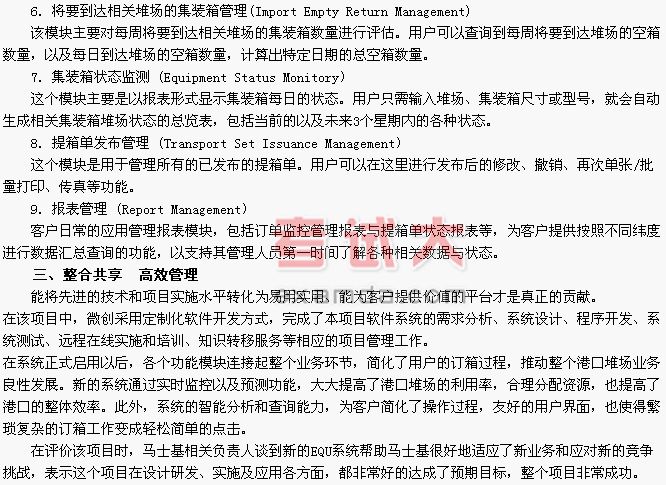 在这个模块中,用户只需简单地录入客户订单号,系统就能根据各种预设规则自动计算推荐最合理的集装箱提箱堆场分配结果。同时,用户也可以实现自定义分配方案的功能,系统根据分配结果直接生成不同风格的提箱单,并可以直接通过传真发送给客户。这也是系统最为重要的功能模块之一。