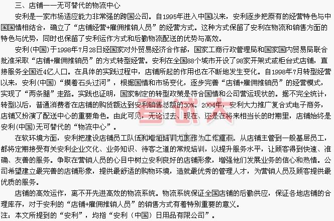 除了人员直销和店铺销售外,安利(中国)公司还开展了家居送货业务,即客户在安利店铺订货,并申请由安利送货上门,这种情况一般在同一城市内可实现。若客户在异地订货,就通过零担方式送货上门。同时,公司还开展基于VRU(电话语音)/Internet(网络)的电子商务配送服务业务,客户可通过电话语音、网络、传真订货,该项业务已在北京、上海、广州三地区开通。在目前银行服务条件下,通过这种方式,货品可在订单形成后72小时内送到消费者手中。如果将来银行服务条件改善,消费者可望在更短的时间内收到货物。